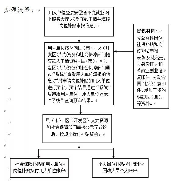 用人单位登录安徽省阳光就业网上服务大厅,按季在线申请并填报岗位补贴申报信息。用人单位按季通过邮寄方式,向县(市)、区(开发区)人力资源和社会保障部门提交纸质申请资料。